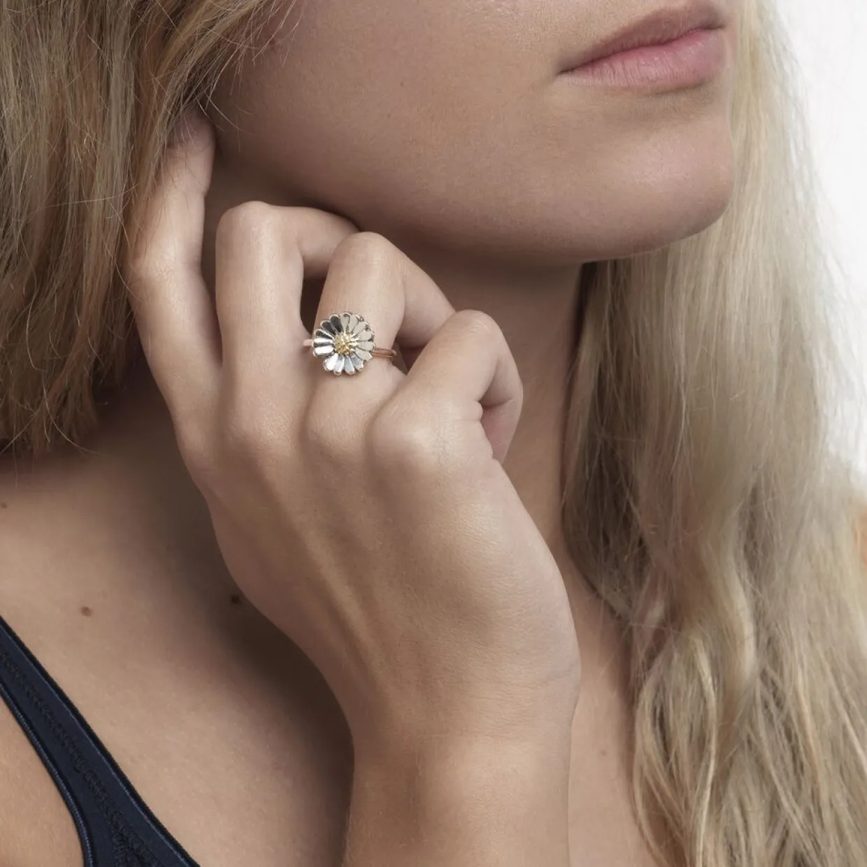 Den smukke bellis i naturlig størrelse er motivet i denne naturtro ring med blomstens sarte stængel som ringskinne.