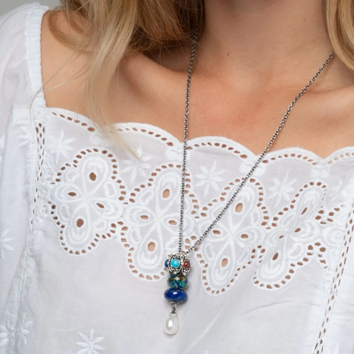 Kæden er fremstillet i oxyderet sterlingsølv med en flot hvid ferskvandsperle fattet i bunden af kæden.